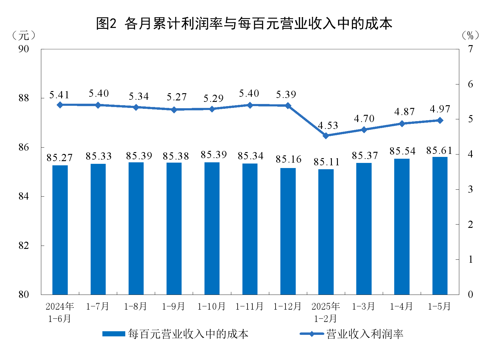 1—5月份,规模以上工业企业实现营业收入54.76万亿元,同比增长2.7%;发生营业成本46.88万亿元,增长3.0%;营业收入利润率为4.97%,同比下降0.19个百分点。